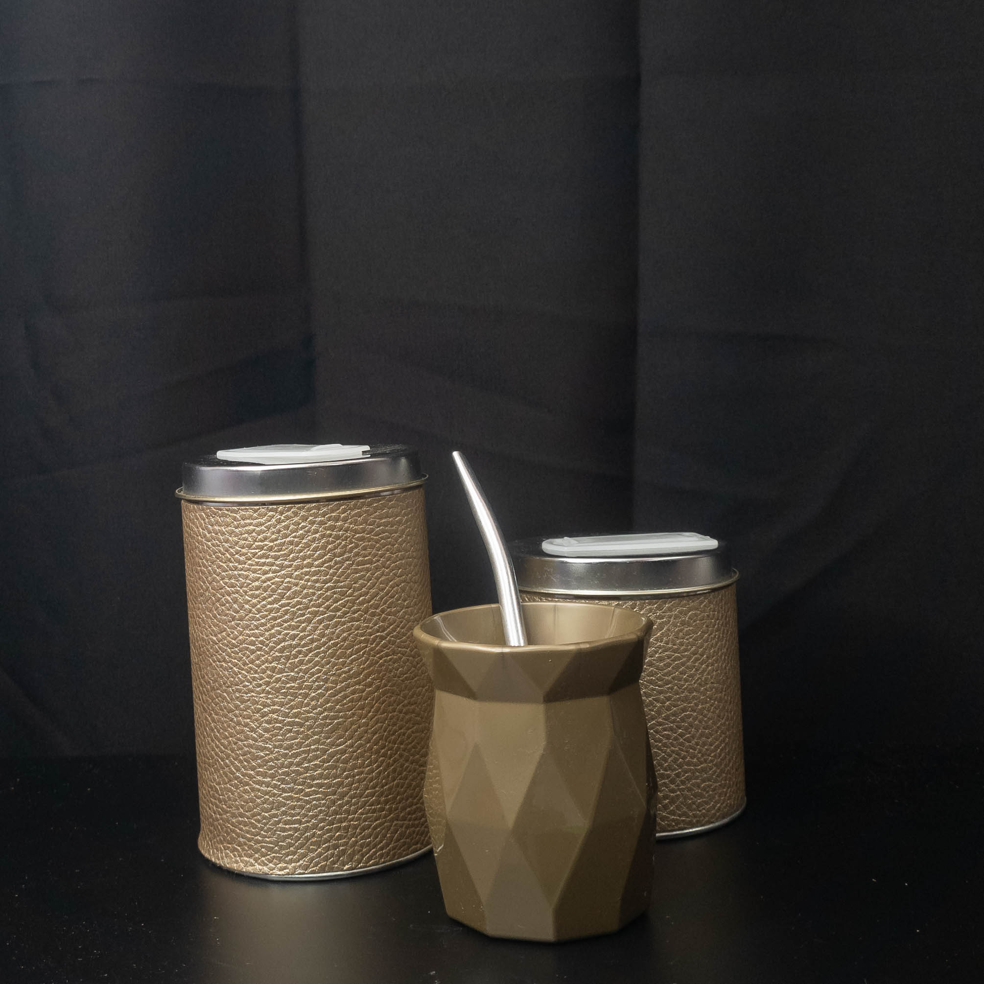 - Lata Porta Yerba y Lata Porta Azúcar: ambas forradas en eco cuero dorado, ofrecen un almacenamiento seguro y elegante.