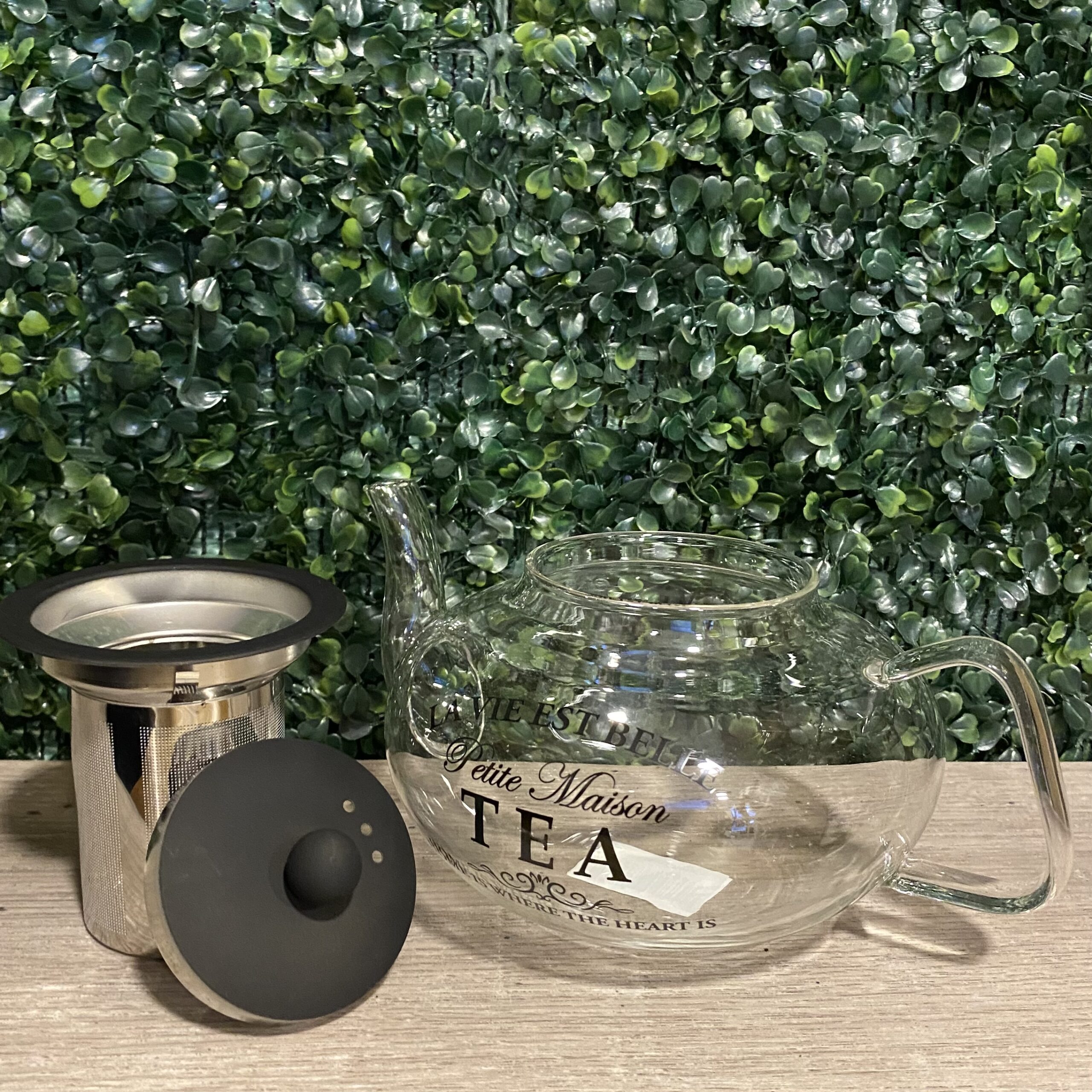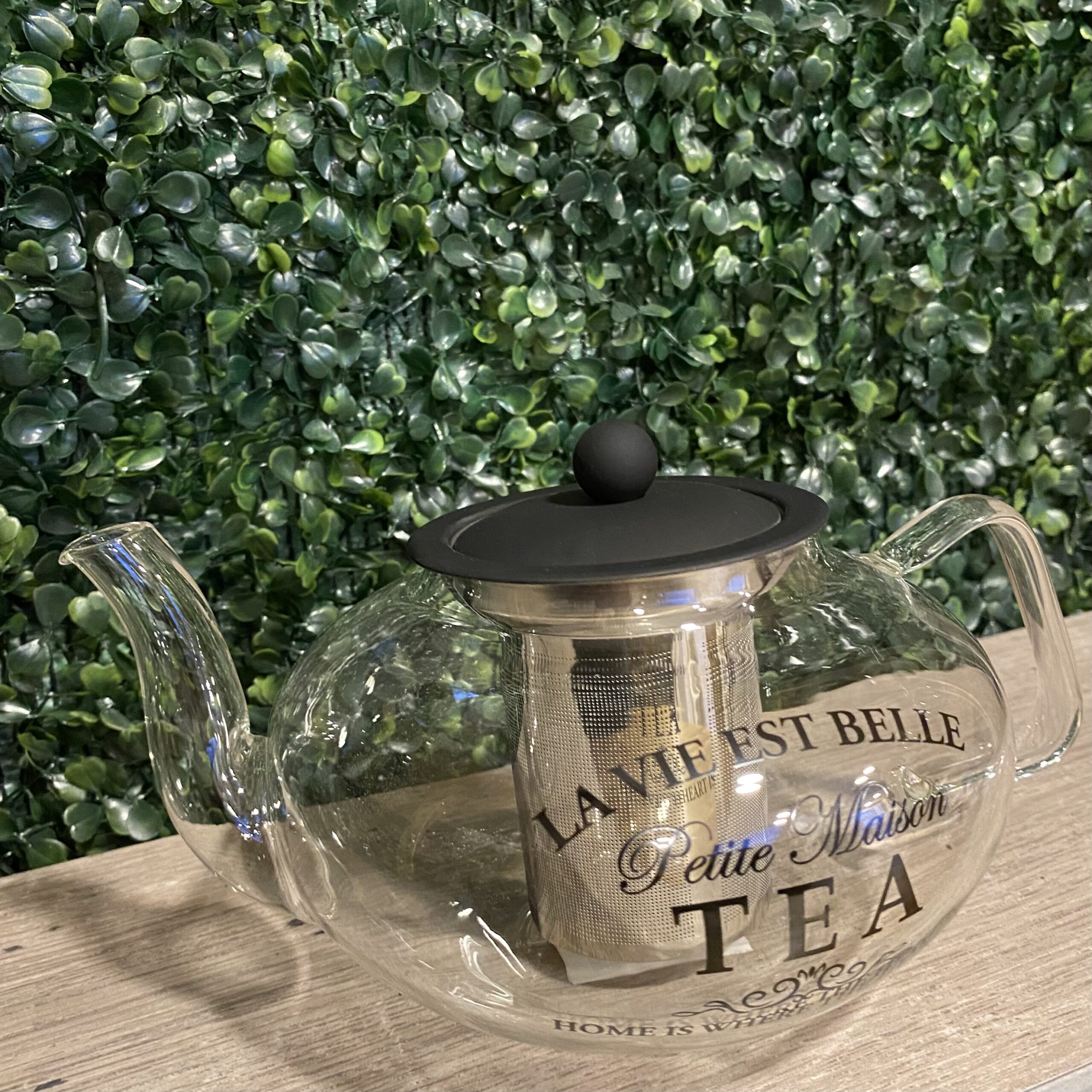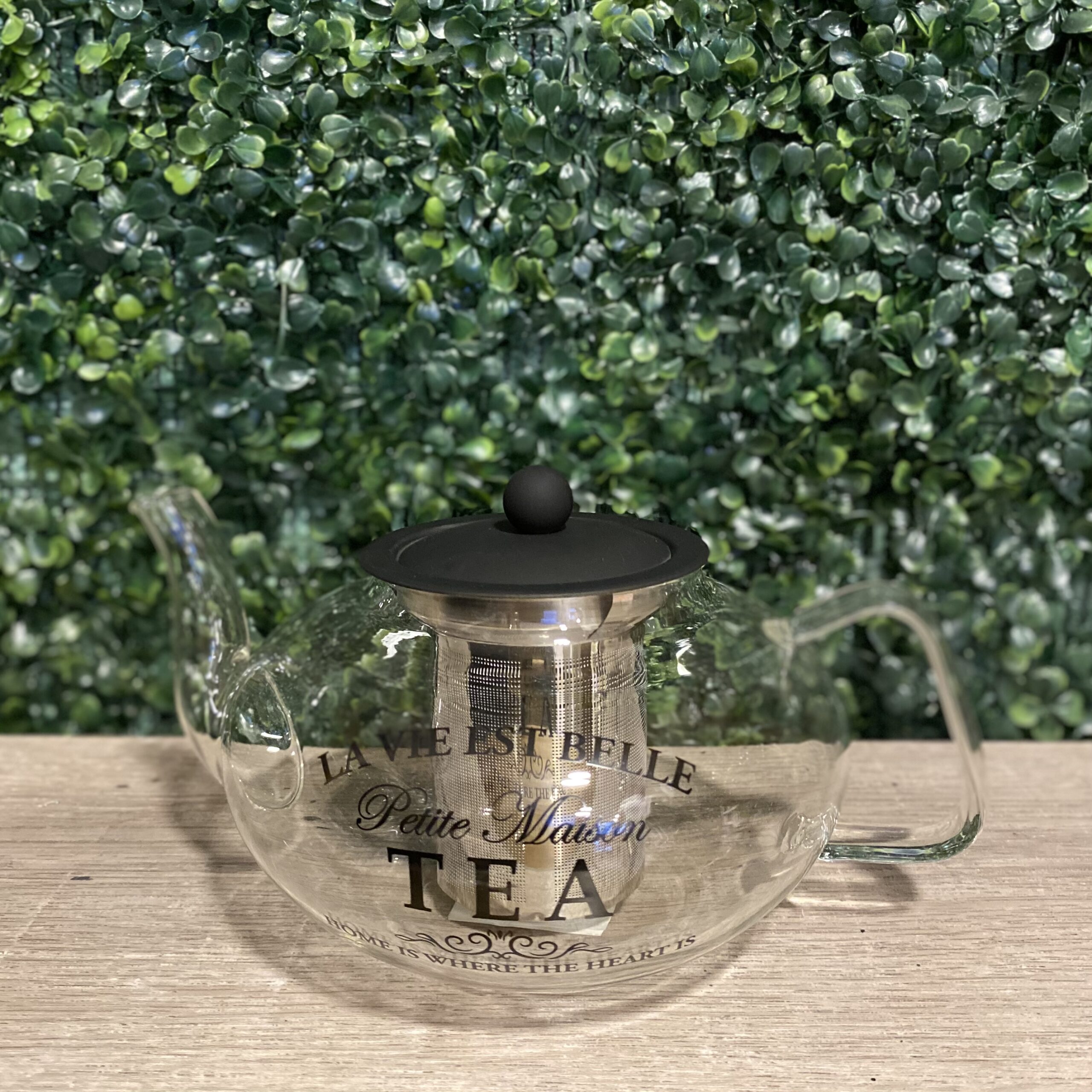 Tetera de vidrio Petit Maison con tapa color negro mate y filtro, el mismo se retira fácilmente para una mejor limpieza de producto.