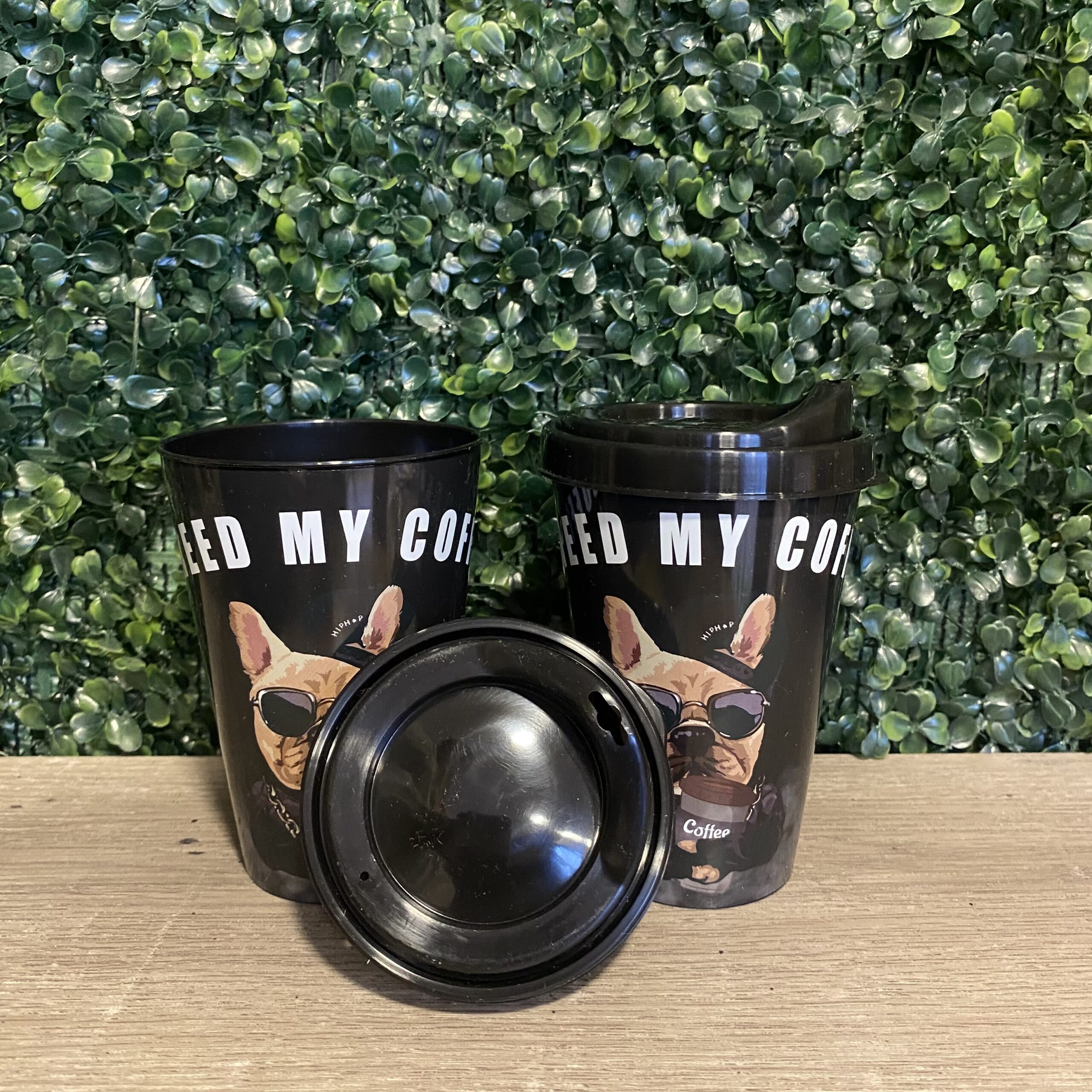 Vaso con tapa a rosca y tapa adicional para evitar derrames al ser transportado.